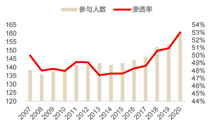 美国户外活动参与人数与渗透率(单位:百万,%)