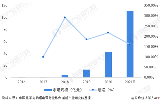 2016-2021年全球便携式储能市场规模(单位:亿元,%)数据来源:中国化学与物理电源行业协会