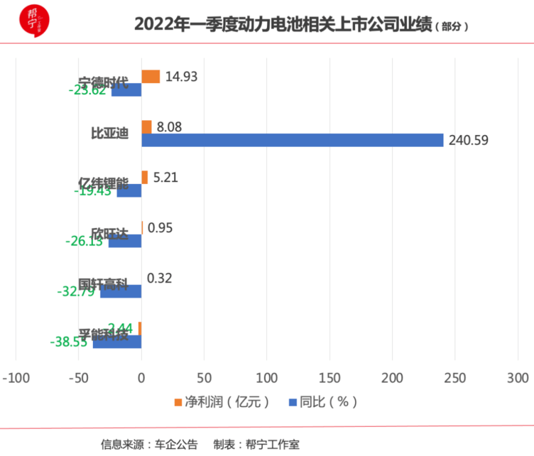 当然,这并不是宁德时代一家公司面临的问题,而是锂电池行业普遍存在的情况。据统计,国轩高科、亿纬锂能、欣旺达等企业一季报基本都是增收不增利。其中,孚能科技、国轩高科等公司净利润下滑幅度超过30%。在业绩集体“哑火”下,比亚迪实现了弯道超车,这得益于新能源汽车销量增加,相关数据显示,一季度比亚迪的汽车销量同比增长422.97%,在一定程度上对冲了上游原材料价格上涨所带来的盈利压力。